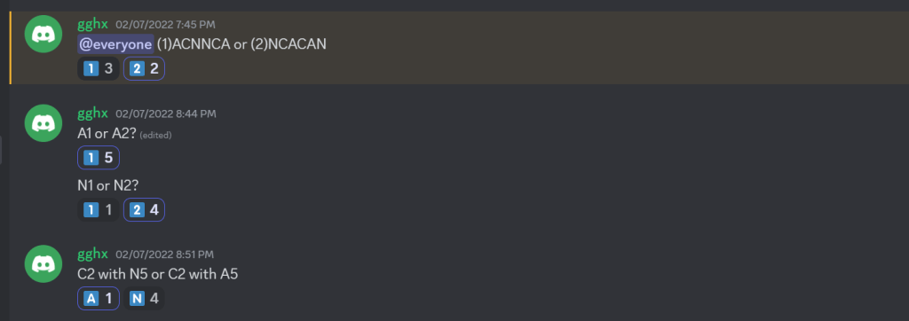 I was originally pretty serious about this – like getting an anonymous vote and feedback form system3, but I soon realised there was no need for such things for an informal contests. We just had to make sure of two things: the problem distribution was good, and P1 was easy4. The rest of the choices were not particularly important, and we just voted on discord.