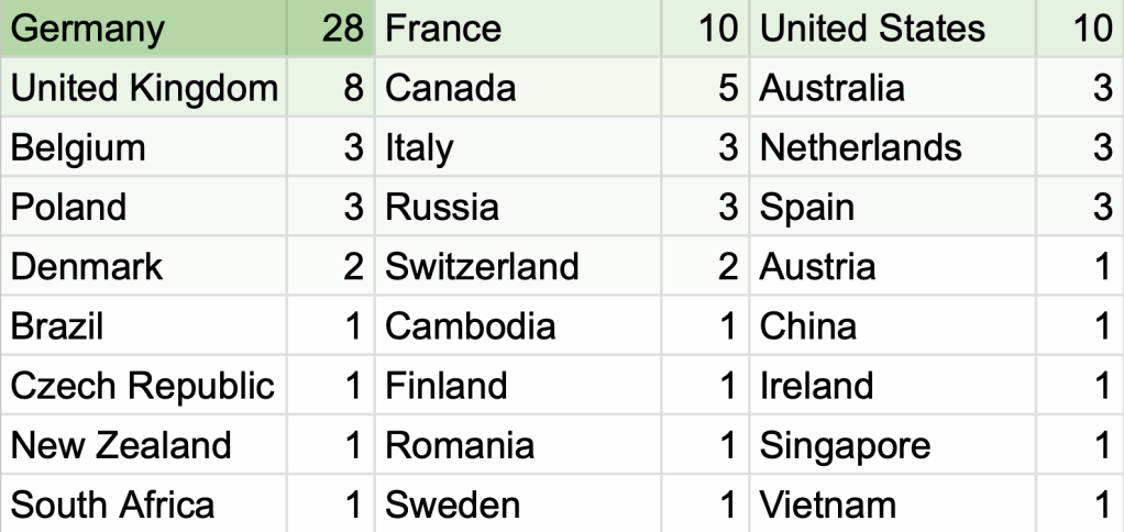 I was also curious about the geographical distribution of top users. Here is the country of the last changeset for the top 100 users, once again using everyone’s favourite data visualisation software Google Sheets.