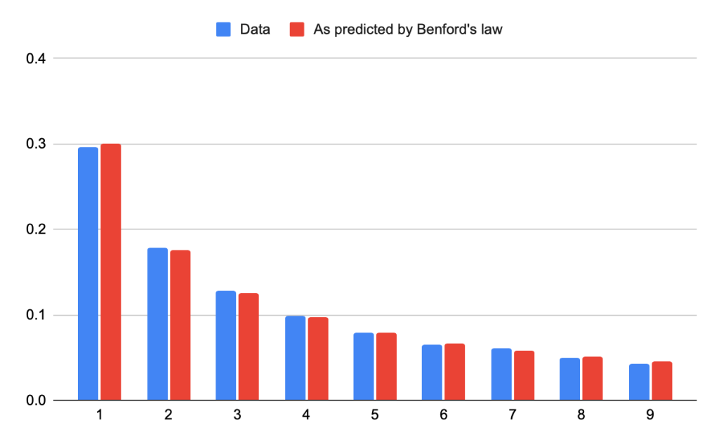 Finally, the morally correct thing to do with a large number of numbers is to test Benford’s law.